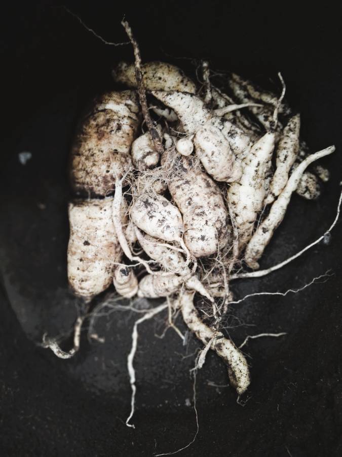 „Guck mal, was ich hier noch habe.“ Meine Tochter nimmt eine Papiertüte aus ihrem Korb, schiebt die Tütenränder auseinander und hält sie mir unter die Nase. Ich sehe sehr helle, fast weiße Wurzelknollen und mutmaße: „Süßkartoffeln?“