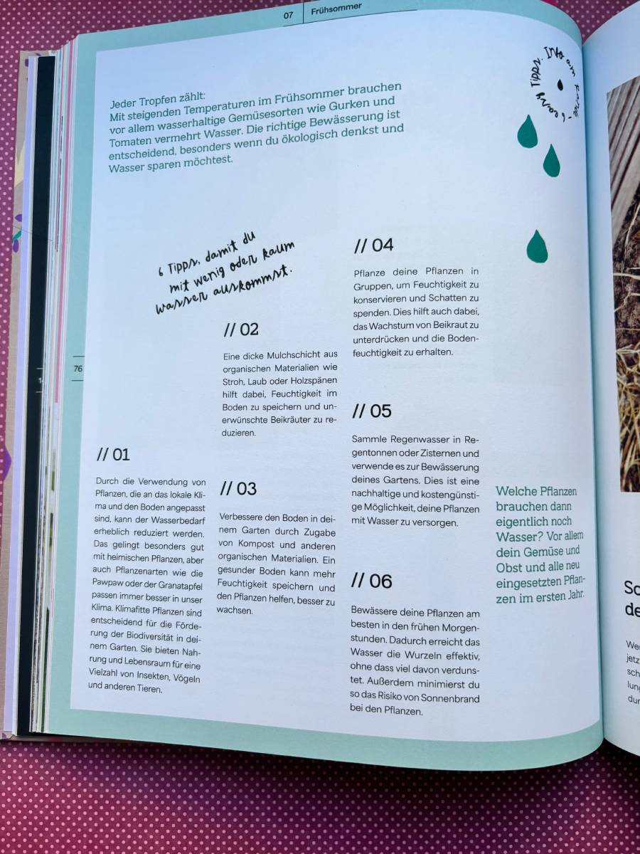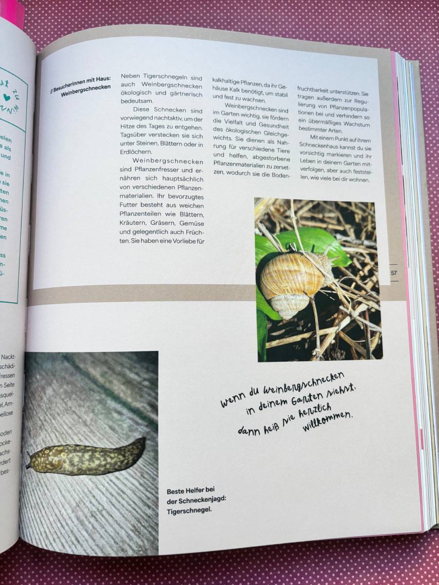 Dabei überzeugt der Ratgeber vor allem durch seine kurzweilig erklärten Arbeitsschritte und zusätzliche Tipps und Tricks, Hinweise zum Recycling und Wiederverwenden von vermeintlichen Gartenabfällen sowie Anleitungen und Ideen für den Artenschutz und das naturnahe Gestalten des eigenen Gartens. Die Schreibweise der Autorin ist locker und sympathisch und lässt einen die Begeisterung für den Garten spüren. Man bekommt schnell Lust, selbst im eigenen Kleingarten aktiv zu werden, und erfährt so manches, das sich einfach und unkompliziert umsetzen lässt. Untermalt wird der Ratgeber immer wieder durch Zitate und Bilder. Generell fällt das Buch durch seine moderne und bunte Gestaltung auf. Verspielte Details und eine farbenfrohe Seitengestaltung lassen schnell vergessen, dass es sich um einen Ratgeber handelt, und machen das Buch zu einem kurzweiligen Zeitvertreib (nicht nur im Winter), das zahlreiche neue Impulse für das Gartenjahr bietet.