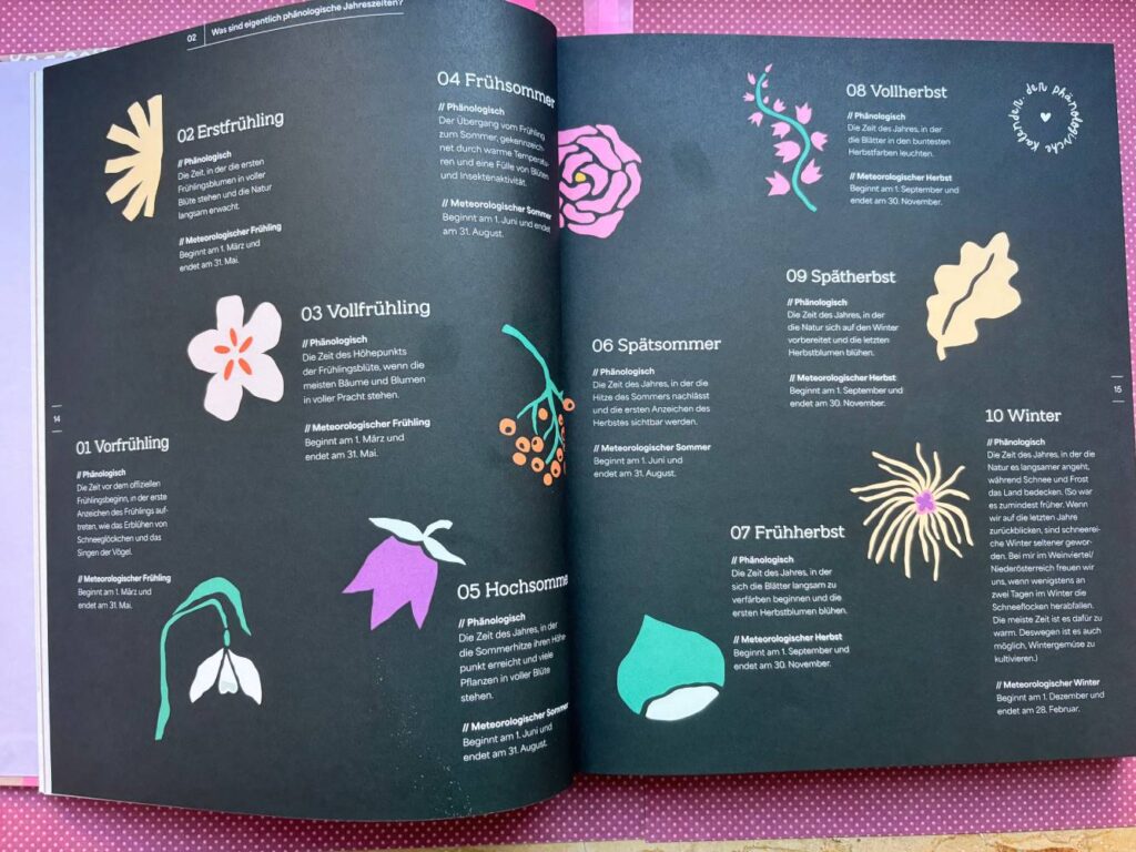 Kern der im Buch erklärten Philosophie ist der phänologische Kalender. Ein System, welches die Jahreszeiten durch die Naturbeobachtung bestimmt. Anstatt starr nach dem Kalender an der Wand zu gärtnern, wird nur das getan, was gemäß der tatsächlichen Jahreszeitentwicklung Sinn ergibt. Am Anfang des Buches steht daher ein Überblick über die zwölf phänologischen Jahreszeiten, ihre typischen Bestimmungsmerkmale in der Natur sowie typische Zeigerpflanzen. Durch diese Hinweise erkennen auch Laien schnell, welche Phase des Jahres im eigenen (Klein)Garten gerade vorherrscht. Anschließend nennen die umfangreichen, aber dennoch kurzweiligen Kapitel Ideen, Aufgaben im Garten, Tipps und Tricks, was jetzt am besten gesät oder geerntet wird, und viele weitere Hinweise zu den Arbeiten, die jetzt am durchgeführt werden sollten.