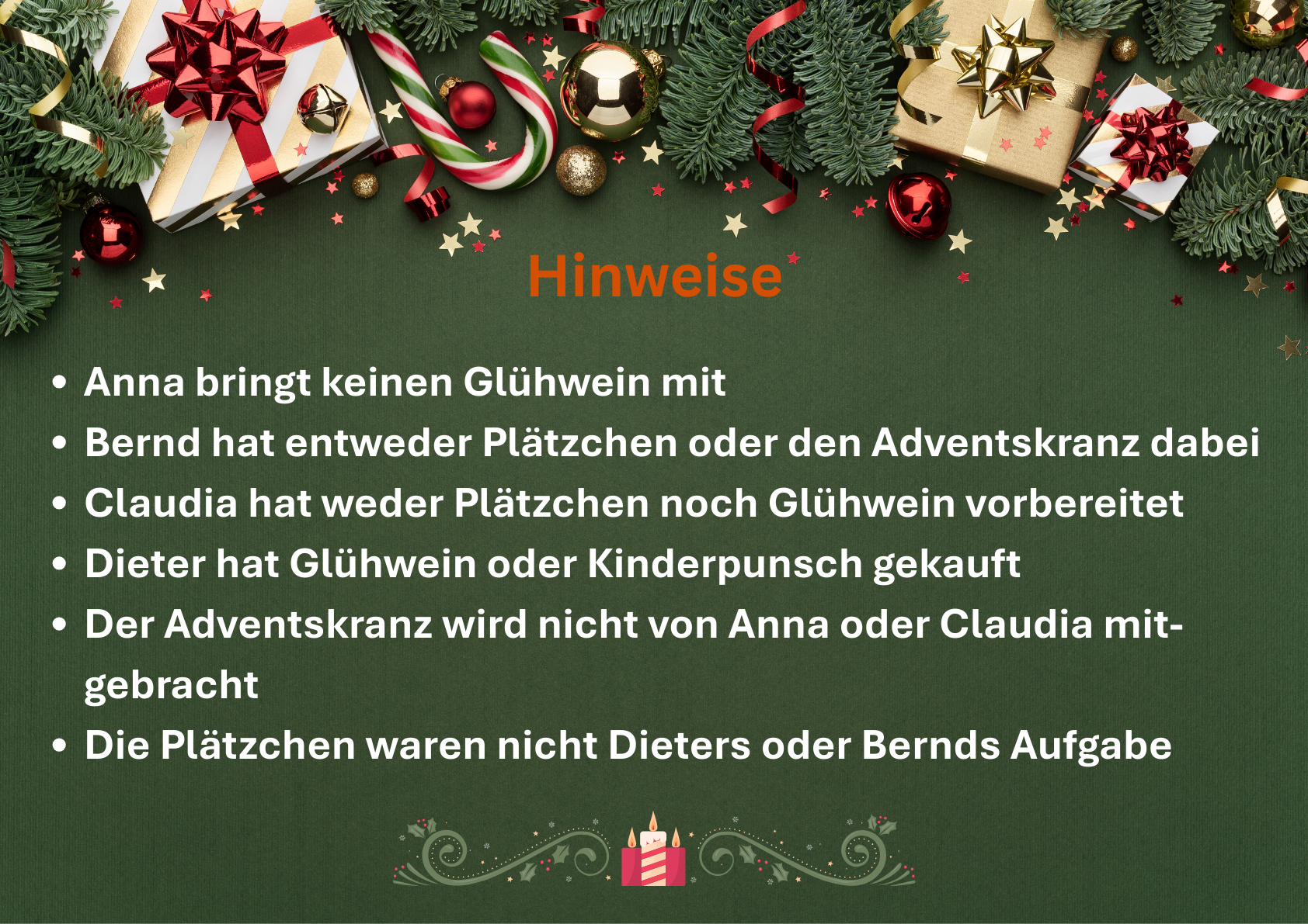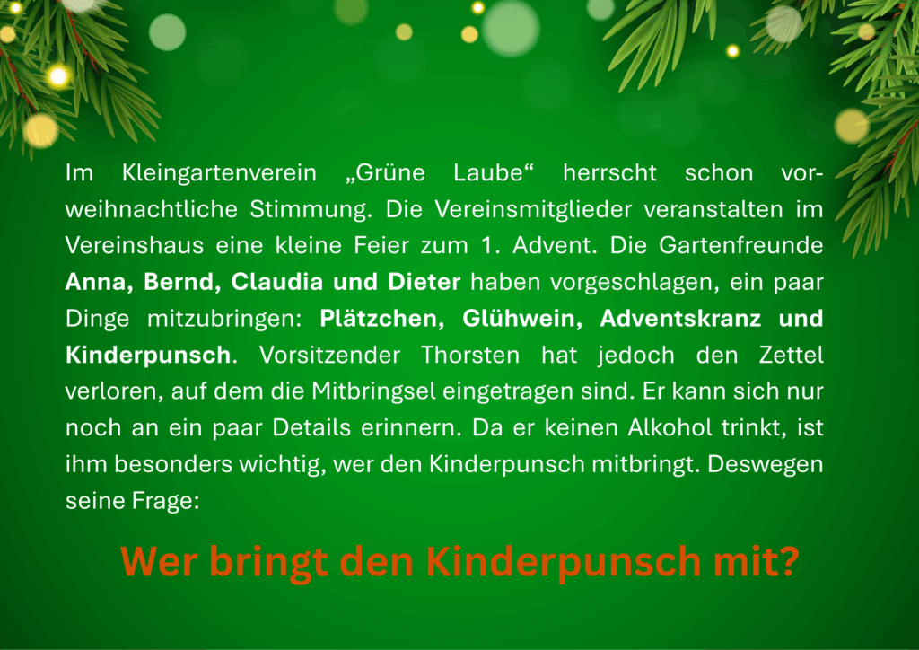 Weihnachten steht vor der Tür und die Adventszeit ist gestartet. Zeit für uns, das Jahr mit einem Rätsel ausklingen zu lassen. Helfen Sie dem Kleingartenverein “Grüne Laube” dabei, eine Adventsfeier zum Abschluss des Gartenjahres zu veranstalten und unterstützen Sie den Vorsitzenden Thorsten bei der Organisation. Alle Details zum Rätsel, den Gewinnen und der Teilnahme lesen Sie im Artikel.