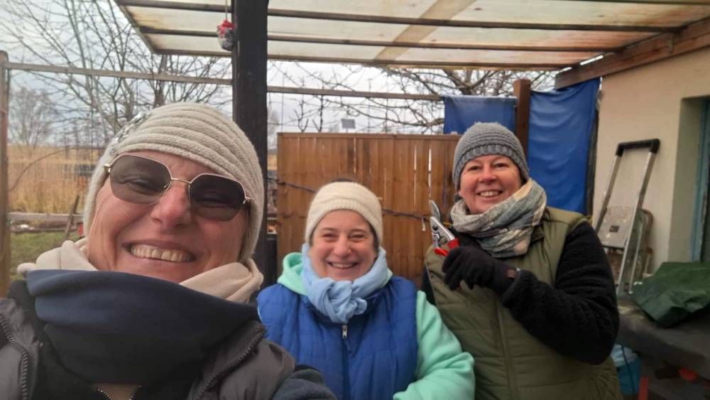 Mit dabei waren Jessica Schwabe vom KGV Trobischfeld e.V. (Verband Dresdner Gartenfreunde e.V.), Claudia Zachow vom KGV Sonnenland Weinböhla, seit Jahren passionierte Bewirtschafterin eines kleinen Weinbergs, und Jacqueline Zettel vom KGV Am Angersteg Freiroda (Kreisverband Delitzsch). Was diese drei Frauen verbindet? Sie haben im vergangenen Jahr erfolgreich ihre Fachberaterausbildung für Kleingartenvereine abgeschlossen – und sie brennen darauf, ihr Wissen praktisch einzusetzen. Jede bringt ihre eigenen Stärken mit: Jessica und Claudia kennen sich hervorragend mit essbaren Blüten und Kräutern aus und wissen genau, was man daraus zaubern kann. Claudia bringt zusätzlich ihre langjährige Erfahrung aus dem Weinberg mit. Jessica weiß zudem, wie Erntegut auf unterschiedliche Arten konserviert werden kann. Jacqueline wiederum liebt den Obst- und Sträucher-Schnitt und hat ein gutes Auge für den richtigen Aufbau und die Pflege der Gehölze. Genau diese Mischung machte den Tag so wertvoll. Denn Fachwissen wird stärker, wenn man es teilt. Unsicherheiten verschwinden, wenn man sie gemeinsam bespricht. Und Erfolge fühlen sich besser an, wenn man sie miteinander erlebt. Kurz gesagt: Es geht nur gemeinsam – und das ist gut so.