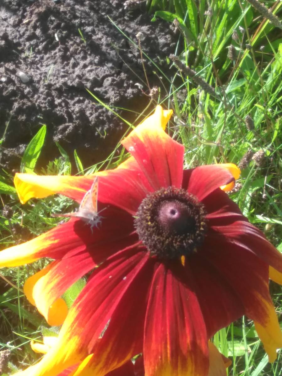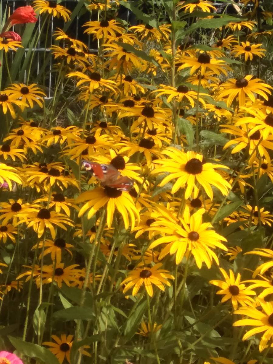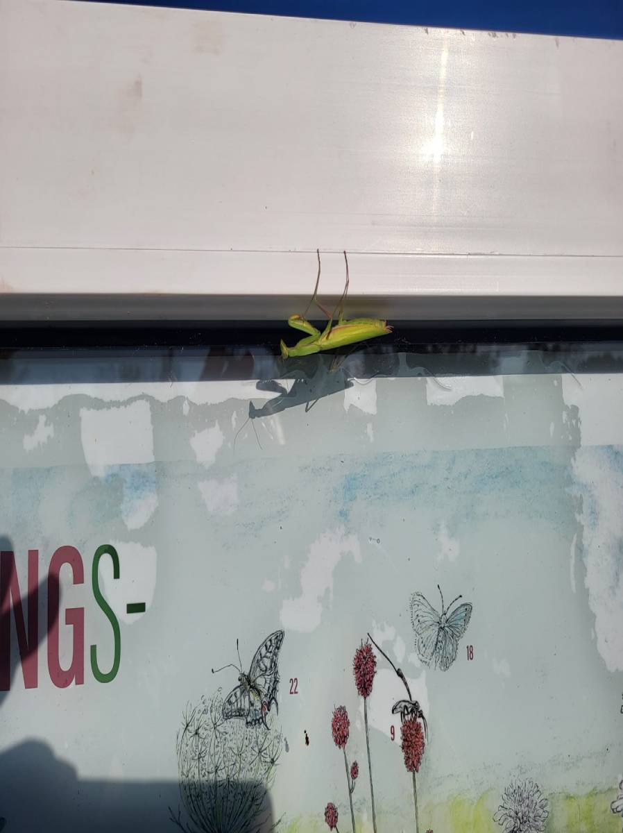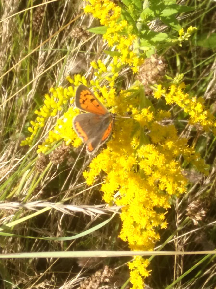 Auch Eidechsen, Frösche und sogar ein „Touristeninsekt“ (Gottesanbeterin) haben hier ein Refugium für sich entdeckt. Auf Goldrute, Hasenklee, Sonnenhut und verschiedenen anderen Gräsern tummeln sich die kleinen Vertreter der Schmetterlingsfamilien. Erstaunlicherweise ist trotz des reichhaltigen Angebotes an Fallobst, besonders unter den Pflaumenbäumen, der sonst übliche Ansturm von Admiral und Tagpfauenauge bisher ausgeblieben. Dafür habe ich bei der ersten Blüte des Lavendels einen sehr großen Andrang, nicht von den sonst üblichen Kohlweißlingen, sondern von Schachbrettfaltern festgestellt. Diesbezüglich ist mir später ein unverhoffter Schnappschuss gelungen. Auch wenn meine Kamera nicht diese magische Anziehungskraft wie die von Herrn Brumm hat, konnte ich zur gleichen Zeit vier Schachbrettfalter auf den vier Blüten einer Flockenblume erfassen.