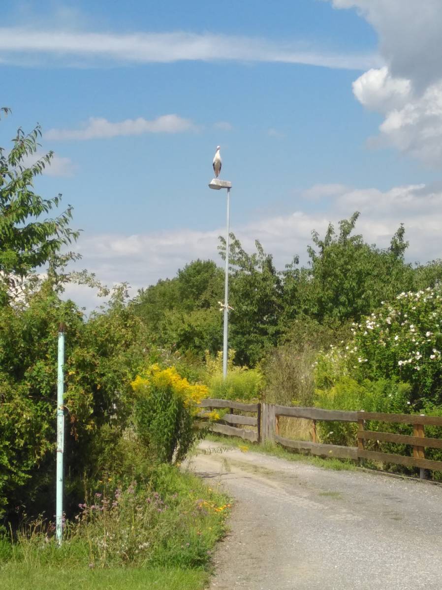 Der Sommer zieht durch die Gärten und nähert sich allmählich seinem Ende. Die Obstbäume stöhnen unter der Last der selten erlebten Fülle an Früchten. Auch die Obstbäumchen unserer kleinen „Streuobstwiese“ schleppen die Fülle ihrer Früchte. Besonders der kleinwüchsige Birnenbaum hat mit seinen 9 mittelgroßen Früchten eine Hochleistung erbracht. Rings um unsere Anlage, und natürlich auch mittendrin, entwickelt sich ein sehr breitgefächertes Tierleben. In der Nachbarschaft hat ein Storchenpaar 2 Jungtiere aufgezogen. Die ganze Storchenfamilie fühlt sich sehr wohl in unserer Anlage, denn sie fanden hier reichlich Baumaterial für ihren Nestbau, Futter für die Jungtiere und einen Flugübungsplatz auf den nicht gern gesehenen hohen Bäumen einiger Gärten.